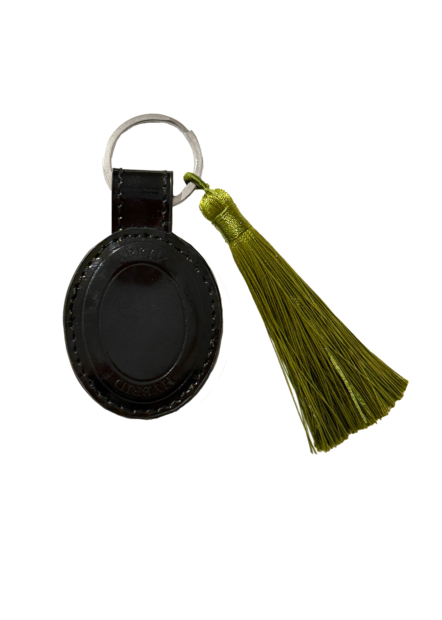 Kat Keyring in Patent Black is made from surplus leather and finished with a green tassel charm.